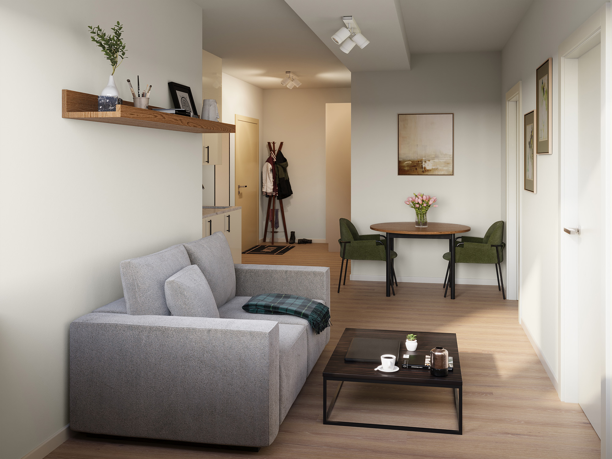 Twin Studio: In February 2026, construction phase 2 of our newest project will be completed! Here you can stay with a friend and have their own bedroom and each their office space. You share a modern kitchen and bathroom. There are good storage options with wardrobes, drawers under the bed and shelves. The residence is located on the 2nd - 5th floor of the property.
